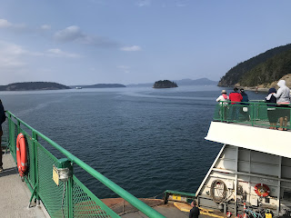 It takes us 2 hours to leave campsite each morning . We don’t seem able to do it any quicker. Away at 8.30 , ride the 5 miles into Annacortes for a hearty breakfast, a bit of grocery shopping and rode the 4 miles to the Islands ferry terminal. An hour’s crossing to Lopez Is.